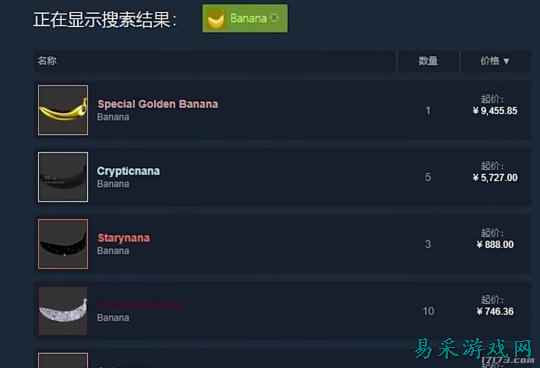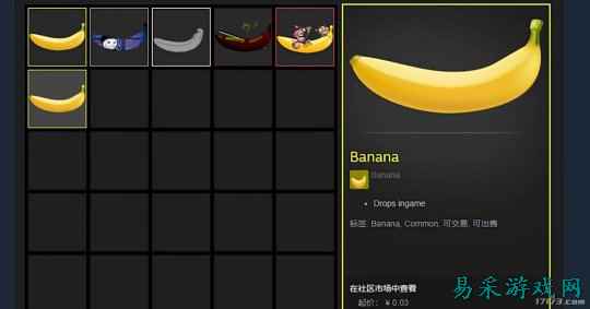 然而,正是这种荒谬,吸引了无数玩家的加入,他们在这简单的重复中寻找着属于自己的乐趣。 就这样,玩家们上班打螺丝,下班打香蕉,虽然打香蕉的枯燥程度与打螺丝分庭抗礼,但玩家们的心情却截然不同——人就是这么不可理喻的动物。 然而,在游戏界面左下角,藏有一个小巧的“Shop”按钮。轻点此按钮,电脑便会自动弹出一个浏览器页面,展示Banana物品商店。这才是游戏能火的关键。 《香蕉》中的香蕉不仅仅是游戏中的道具,它们在Steam市场上有着真实的价值。物品商店中,交易的正是玩家们收集的这些“赛博香蕉”。一根普通的香蕉只值几分钱,但稀有的香蕉却能卖出天价。