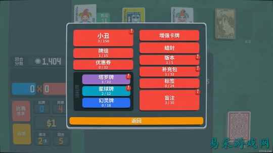 到了后期,当你拥有了越来越多的小丑加成牌,结算时数字翻N番的乐趣会充分激发出你的多巴胺。但为了让事情变得更有选择性,你一次最多能装备五张小丑牌,所以如果你发现了特别心仪的新小丑牌,就必须出售已有的小丑牌空出位置。 游戏中加入了丰富的BD构筑元素,除了不同的牌组和小丑牌,塔罗牌、星球牌、幽灵牌和代金券,多种功能性的卡牌令游戏充满了变数与惊喜。