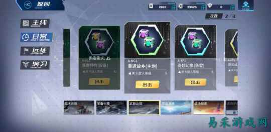 除主线推图以外,做战术训练、军备科技、武器运输等日常任务以获得武器证书、技能基础素材,舰灵经验等强化素材,材料获取没有扫荡。