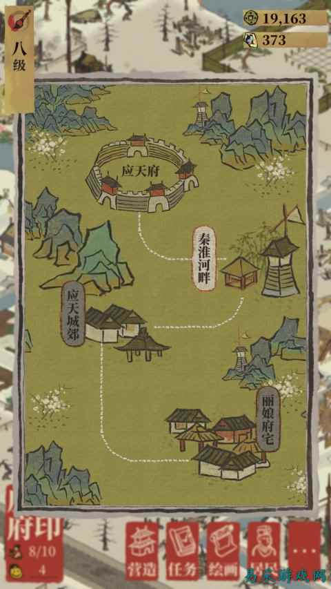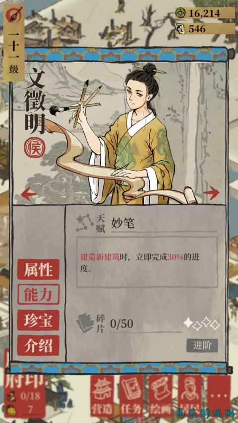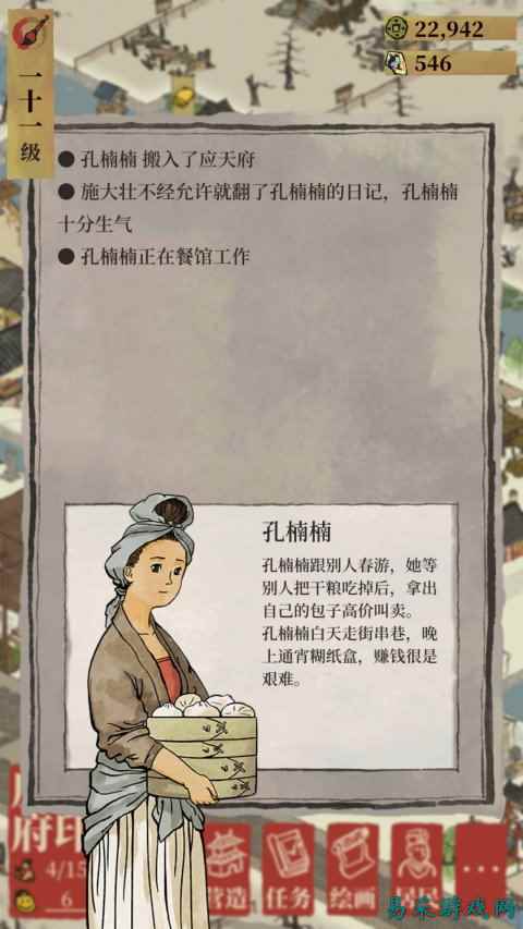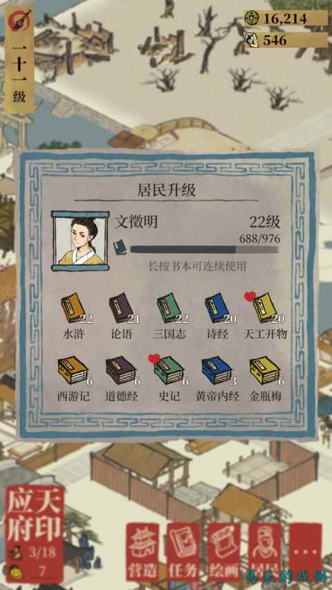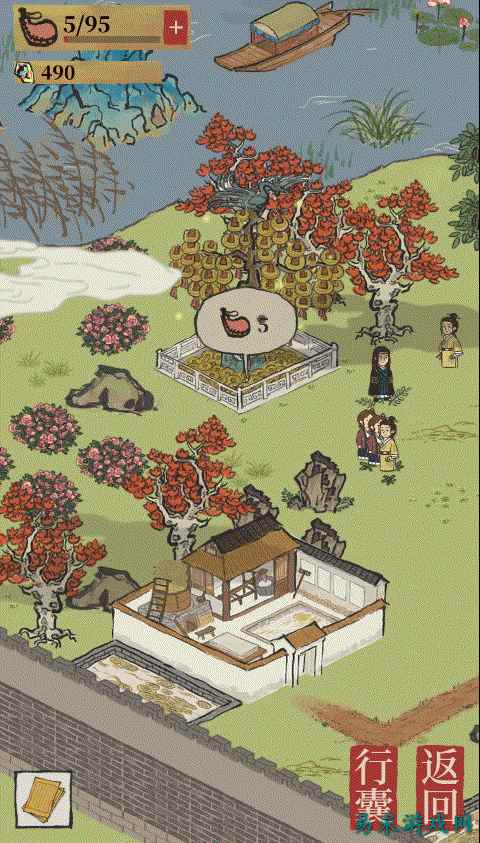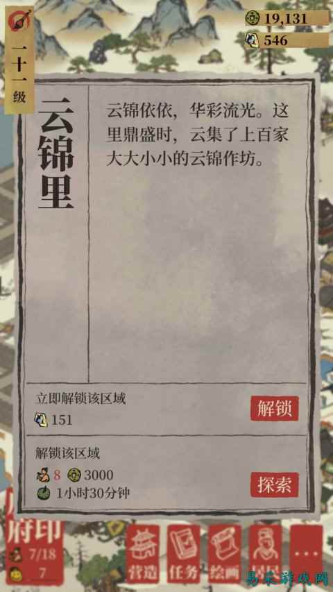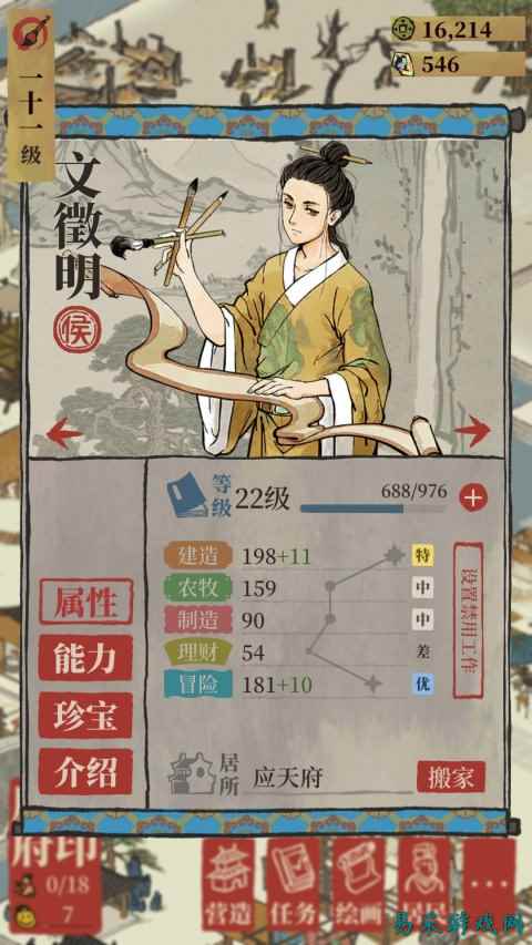 《江南百景图》是一款由椰岛(《中国式家长》的发行商)推出的国风经营游戏,在这款游戏中,你将来到一个古色古香的墨色江南,从一片破败不堪的废墟开始,建设属于自己的城市。 游戏不仅真实再现了古代江南的建筑风貌,还打造出一种神似于《清明上河图》的市井气息。你能看见居民在城市中行走,商贩挑着货物走街串巷,还有一群小孩混在一起嬉闹,充满了生机。 在城市中,你还有机会偷听到居民之间的谈话,或是闲聊生活中的二三事,亦或是讨论坊间的八卦传闻,更有诸多令人啼笑皆非的对话,等着你去发现。 有时候会遇到收购物品的西域商贾,如果手头的有多余的物资,可以交易给对方换取铜钱、经验值以及资源。 也有时候,会逮到逃窜的盗贼,可以将其羁押,并安排狱卒审讯,一段时间过后,就能从盗贼的包裹里获得丰厚的物资。 住在民居里的每个小人,也都有自己的故事,还会跟同院的邻居发生各种各样的交集,有的和睦相处,有的争吵不休,留下一个个耐人寻味的小故事。游戏中各处忙碌的小人,不断地创造出生活的气息,让人觉得,这就是心中理想的江南! 作为一个经营游戏,《江南百景图》自然也是少不了各种建筑。游戏的“营造”栏目中,有四种类型的建筑,分别是居住、生产、娱乐以及装饰,暂时不用的建筑可以放进“已存”保管。 在“居住”类型中,主要包括增加人口的民居、储存物资的仓库以及能够赚取铜钱的商业建筑;而“生产”则有着多种资源建筑,包含农田、林场、餐馆以及造纸厂等,而且相互之间环环相扣,比如农田产出的蔬菜可以在餐馆中制作成食物,林场中的原木,可以在锯木厂中制作成木板,进而在造纸厂中制作成纸张。 随着等级的提升,建筑的数值也会发生变化。但让人一时难以理解的是,有的建筑等级越高,单位时间的效率反而越低,不知是数值策划的失误,还是为玩家提供挂机和爆肝两种玩法。同时,高级的选项不仅要征用普通居民作为劳力,还得有“特殊居民”作为负责人监督生产。 在“娱乐”和“装饰”项目中,所有的建筑和花木都能增加城市的繁荣度,每当繁荣度达到一定条件时,就会解锁一个民居,从而增加居民人口数量,为城镇提供更多的劳动力。 不过,在《江南百景图》中,每个建筑并非随便摆放就可以,还带有很强的策略性。一方面,游戏中大部分建筑都需要紧靠道路,而道路又会占用土地资源,玩家需要思考,如何在铺设最少道路的同时,让建筑布局的数量最大化。 另一方面,游戏中还有着各类神像,比如灶神像、织女像以及财神像等,这些神像对特定的建筑有一定的加成。比如灶神像能提高餐馆的产能,织女像能提高纺织厂、制衣厂的效率,财神像则提高对各类商业建筑的收益。 虽然这些神像的效果惊人,但既不能像建筑一样随意移动,又只有2~3格的影响范围,因此玩家必须围绕着它们放置建筑,又进一步加大了布局的复杂度。 此外,个别建筑对环境有需求,比如家具铺,需要所在地环境达到和谐才可以升级。 通过“环境”视角可以看到,和谐的地方呈现为绿色,环境一般的没有颜色,不和谐的则为红色,玩家能够通过摆放装饰物,也就是花草、树木等,来实现环境的“净化”。当然,这些装饰物也要占用空间,或多或少地会影响到整体的布局。 当土地不够用的时候,可以消耗人力、铜钱和时间,探索并解锁新的区域,将原本的残垣断壁、枯木清除干净,便又能获得一片宽阔的天地。 可以看出,《江南百景图》不仅仅是个放置经营游戏,更看重玩家对城市的规划策略,随着城镇的扩张和建筑的增多,空间布局的配置也会变得越来越复杂。进入苏州府之后,更不单要建设城镇,还要协调两府之间的资源,可见游戏之烧脑了。 在《江南百景图》的驿站中,可以体验趣味的探险玩法,从所在的应天府,来到风景秀丽的秦淮河畔,展开一段奇妙的旅程。 在探险中,主要是线性RPG的模式,玩家将走进原创的剧情故事,和一个个历史人物相遇。 随着剧情的发展,玩家需要完成一个个小任务,包括收集、修复、制造、购买等,还能得到物资、画轴等奖励。当完成一个地区的系列任务之后,还会驱散迷雾,解锁下一个区域的地图,更深入地探索。 地图中会出现发财树,砍倒后会得到大量的铜钱,让你秒变土豪。 探险中几乎每个动作都需要消耗能量,最少的野猪需要五点能量,大型的建筑则需要四五十点,很快就会把玩家的能量消耗得干干净净。运气好碰到零消耗的泉水,可以瞬间补充五十点能量,让你再玩几分钟。 没有泉水的时候,如果着急通关,就得看广告解决了,笔者比较佛系,一般用完用完几个角色的探险能量后就静等恢复。在这种能量匮乏的情况下,玩家每次都只能体验一小段,即便游戏机制异常简单,也能吊足了玩家的胃口。 《江南百景图》中的“特殊居民”需要消耗卷轴进行“绘画”来获得,也就是常见的抽卡机制。值得一提的是,在抽卡时,玩家需要先在画布上挥毫泼墨,展现自己的才华,对完全没有艺术细胞的笔者来说,只能像阴阳师一样鬼画符了。 根据品质的不同,角色分为卿、侯、天三个档次,验证大家欧非的时候又到了! 每个角色都有建造、农牧、制造、理财以及冒险五个维度的属性,根据数值的的高低,有着差、中、优、特等四个档次的评价。 在派遣负责人时,角色对应的属性会转化为加成效果显示出来。比如在生产木板、纺织布匹时,对应