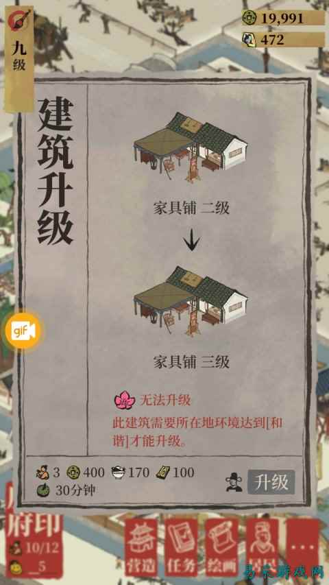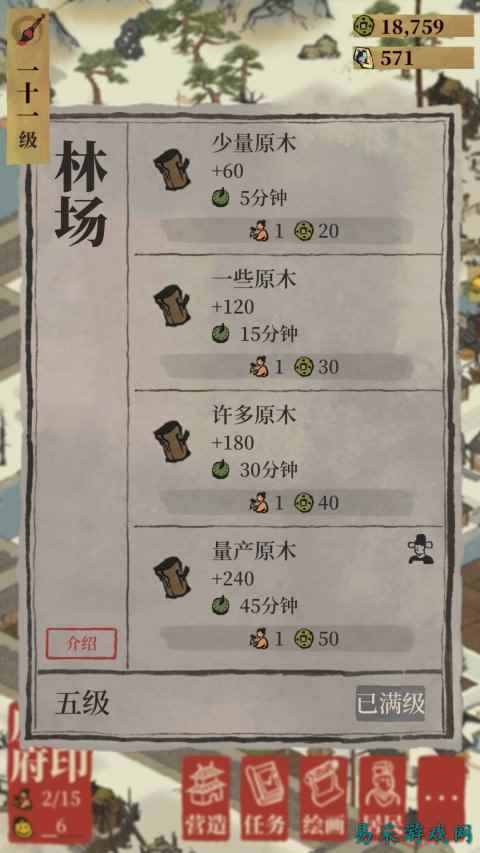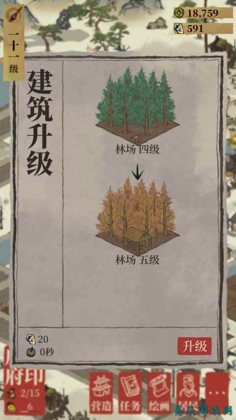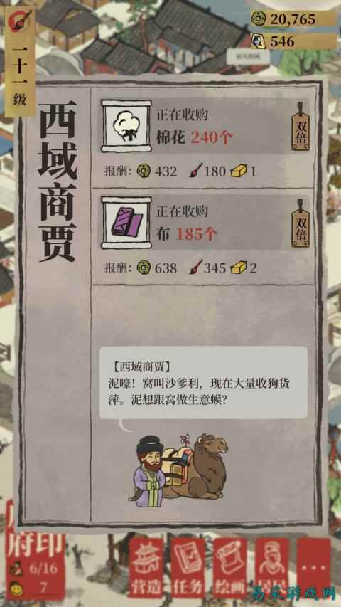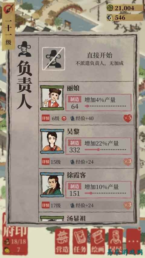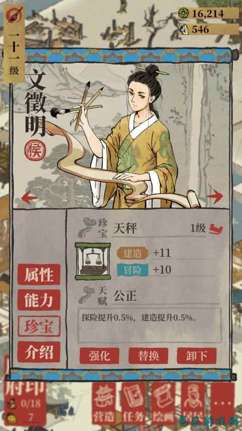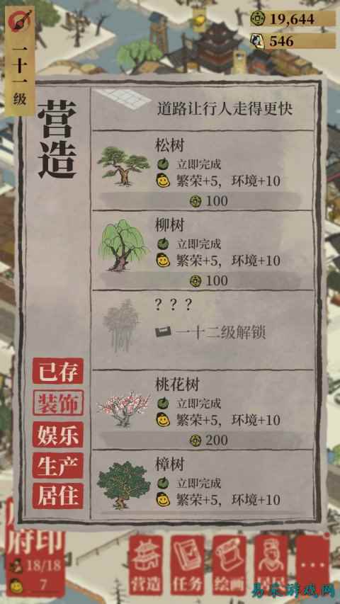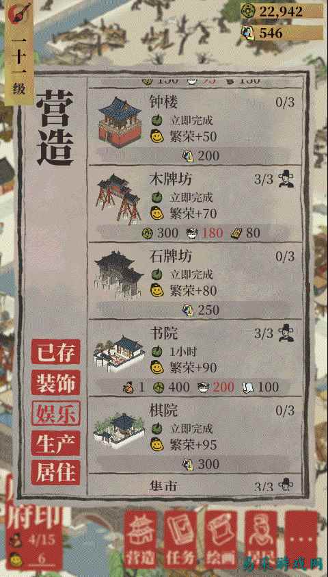 《江南百景图》是一款由椰岛(《中国式家长》的发行商)推出的国风经营游戏,在这款游戏中,你将来到一个古色古香的墨色江南,从一片破败不堪的废墟开始,建设属于自己的城市。 游戏不仅真实再现了古代江南的建筑风貌,还打造出一种神似于《清明上河图》的市井气息。你能看见居民在城市中行走,商贩挑着货物走街串巷,还有一群小孩混在一起嬉闹,充满了生机。 在城市中,你还有机会偷听到居民之间的谈话,或是闲聊生活中的二三事,亦或是讨论坊间的八卦传闻,更有诸多令人啼笑皆非的对话,等着你去发现。 有时候会遇到收购物品的西域商贾,如果手头的有多余的物资,可以交易给对方换取铜钱、经验值以及资源。 也有时候,会逮到逃窜的盗贼,可以将其羁押,并安排狱卒审讯,一段时间过后,就能从盗贼的包裹里获得丰厚的物资。 住在民居里的每个小人,也都有自己的故事,还会跟同院的邻居发生各种各样的交集,有的和睦相处,有的争吵不休,留下一个个耐人寻味的小故事。游戏中各处忙碌的小人,不断地创造出生活的气息,让人觉得,这就是心中理想的江南! 作为一个经营游戏,《江南百景图》自然也是少不了各种建筑。游戏的“营造”栏目中,有四种类型的建筑,分别是居住、生产、娱乐以及装饰,暂时不用的建筑可以放进“已存”保管。 在“居住”类型中,主要包括增加人口的民居、储存物资的仓库以及能够赚取铜钱的商业建筑;而“生产”则有着多种资源建筑,包含农田、林场、餐馆以及造纸厂等,而且相互之间环环相扣,比如农田产出的蔬菜可以在餐馆中制作成食物,林场中的原木,可以在锯木厂中制作成木板,进而在造纸厂中制作成纸张。 随着等级的提升,建筑的数值也会发生变化。但让人一时难以理解的是,有的建筑等级越高,单位时间的效率反而越低,不知是数值策划的失误,还是为玩家提供挂机和爆肝两种玩法。同时,高级的选项不仅要征用普通居民作为劳力,还得有“特殊居民”作为负责人监督生产。 在“娱乐”和“装饰”项目中,所有的建筑和花木都能增加城市的繁荣度,每当繁荣度达到一定条件时,就会解锁一个民居,从而增加居民人口数量,为城镇提供更多的劳动力。 不过,在《江南百景图》中,每个建筑并非随便摆放就可以,还带有很强的策略性。一方面,游戏中大部分建筑都需要紧靠道路,而道路又会占用土地资源,玩家需要思考,如何在铺设最少道路的同时,让建筑布局的数量最大化。 另一方面,游戏中还有着各类神像,比如灶神像、织女像以及财神像等,这些神像对特定的建筑有一定的加成。比如灶神像能提高餐馆的产能,织女像能提高纺织厂、制衣厂的效率,财神像则提高对各类商业建筑的收益。 虽然这些神像的效果惊人,但既不能像建筑一样随意移动,又只有2~3格的影响范围,因此玩家必须围绕着它们放置建筑,又进一步加大了布局的复杂度。 此外,个别建筑对环境有需求,比如家具铺,需要所在地环境达到和谐才可以升级。 通过“环境”视角可以看到,和谐的地方呈现为绿色,环境一般的没有颜色,不和谐的则为红色,玩家能够通过摆放装饰物,也就是花草、树木等,来实现环境的“净化”。当然,这些装饰物也要占用空间,或多或少地会影响到整体的布局。 当土地不够用的时候,可以消耗人力、铜钱和时间,探索并解锁新的区域,将原本的残垣断壁、枯木清除干净,便又能获得一片宽阔的天地。 可以看出,《江南百景图》不仅仅是个放置经营游戏,更看重玩家对城市的规划策略,随着城镇的扩张和建筑的增多,空间布局的配置也会变得越来越复杂。进入苏州府之后,更不单要建设城镇,还要协调两府之间的资源,可见游戏之烧脑了。 在《江南百景图》的驿站中,可以体验趣味的探险玩法,从所在的应天府,来到风景秀丽的秦淮河畔,展开一段奇妙的旅程。 在探险中,主要是线性RPG的模式,玩家将走进原创的剧情故事,和一个个历史人物相遇。 随着剧情的发展,玩家需要完成一个个小任务,包括收集、修复、制造、购买等,还能得到物资、画轴等奖励。当完成一个地区的系列任务之后,还会驱散迷雾,解锁下一个区域的地图,更深入地探索。 地图中会出现发财树,砍倒后会得到大量的铜钱,让你秒变土豪。 探险中几乎每个动作都需要消耗能量,最少的野猪需要五点能量,大型的建筑则需要四五十点,很快就会把玩家的能量消耗得干干净净。运气好碰到零消耗的泉水,可以瞬间补充五十点能量,让你再玩几分钟。 没有泉水的时候,如果着急通关,就得看广告解决了,笔者比较佛系,一般用完用完几个角色的探险能量后就静等恢复。在这种能量匮乏的情况下,玩家每次都只能体验一小段,即便游戏机制异常简单,也能吊足了玩家的胃口。 《江南百景图》中的“特殊居民”需要消耗卷轴进行“绘画”来获得,也就是常见的抽卡机制。值得一提的是,在抽卡时,玩家需要先在画布上挥毫泼墨,展现自己的才华,对完全没有艺术细胞的笔者来说,只能像阴阳师一样鬼画符了。 根据品质的不同,角色分为卿、侯、天三个档次,验证大家欧非的时候又到了! 每个角色都有建造、农牧、制造、理财以及冒险五个维度的属性,根据数值的的高低,有着差、中、优、特等四个档次的评价。 在派遣负责人时,角色对应的属性会转化为加成效果显示出来。比如在生产木板、纺织布匹时,对应