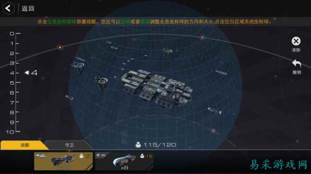 《末日远征》最特别之处在于它采用了3D立体化的建模,你的防守部队不再是部署在一个空间平面上,所以你也不用去考虑修建什么围墙。你需要的是在你的母舰周围合理地部署战舰用于防守地方的进攻。在部队的部署上,游戏设计了一个球面,通过0-10级的纵深轴让来调整单位的位置。你可以让你的飞船紧紧靠着你的母舰,也能够让它们在最远距离均匀分布。