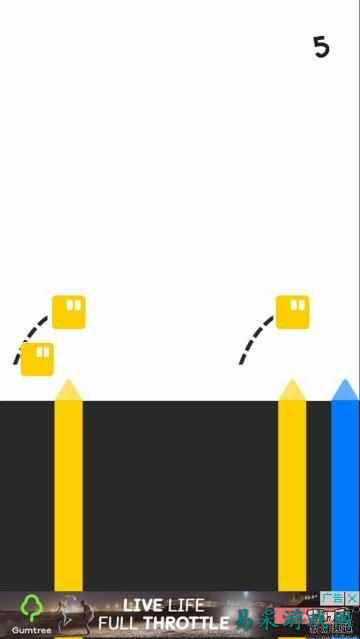 游戏的界面十分简洁,由简单的平台和不同颜色的尖刺构成,游戏的主角是方块,玩家要控制方块从尖刺上跳过,准确地说玩家要控制方块从相同颜色的尖刺上跳过,例如黄色的方块就要从黄色的尖刺上跳过,有时候会遇到一排好几个尖刺,你必须要在相同颜色的尖刺旁边跳过,不同颜色的尖刺对你不造成任何影响。如果碰到相同颜色的尖刺没有跳过那么就game over。