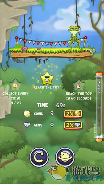 春回大地,天气变暖了,树绿了,草青了,各种小动物都苏醒过来了,到处生机勃勃,一派欣欣向荣的景象,喵星人汪星人都按耐不住深闺的寂寞,都在家里上蹿下跳,连农田里的青蛙王子哥哥们都按捺不住冬眠的寂寞了,欢呼雀跃的表现自己,表示一定要给农田里丑丑的“青蛙王子”们正名,它们不只是能给人类去除夏日蚊子的骚扰,还能一飞冲天冲出银河系,来担任地球与外星球的萌系使者。今天小编带来的一款游戏《Froggy Jump2》青蛙跳跃2就是一款休闲重力感应游戏,操作玩法都与早年大热的《悟空蹦蹦蹦》都非常相似,卡通可爱的大青蛙,准备穿起超人披风,穿梭银河系,去担任地球与外星球的小使者,来看看这个小青蛙是否能担此大任。 画面评价:★★★ 《Froggy Jump2》青蛙跳跃2在游戏画面的表现能力上,绝对是对的起这个“萌”字的,即使是游戏场景中的蘑菇小道具,在青蛙蹦高碰触时所产生的画面特效,触发出小道具的特色。玩家在感受游戏时,即可以感受到游戏中森林气息的大自然扑鼻而来,更能感受到银河宇宙星系的浩瀚神秘。 游戏中采用2种游戏模式,分为关卡模式与无尽模式,在关卡模式中,咱们的青蛙王子乘着火箭,遨游宇宙大太空,每冲过一关,都会有一个小星球的星星评价亮起,让玩家在体验游戏时,胜利感与满足感不言而喻。并且在宇宙关卡中,每个主题关卡的主题背景设定也不尽相同,更是在特定的场景加入了特定的元素出现,都给玩家带来了不一样的视觉体验。 游戏结束时,出现的转盘式特殊奖励,黄色搭配绿色的大自然背景,都不带出一丝突兀。作为一款休闲重力感应游戏,游戏的界面必然是采用竖面画面模式,搭配上萌系又充满大自然气息的背景图,让玩家一进入游戏就能马上感受到了轻松愉悦的心情,在游戏过程的时候,随着高度的不断爬升,青蛙也会不断的变化表情与动作,时而大眼睛突兀,时而两个爪子张开遨游空中,都增加了不少喜感,这些小细节的精细处理,都让游戏的主题呼之欲出。但是由于此类游戏的一个弊端,在无尽模式中,长期出现的场景设定以及不变的颜色等,只是旁边的分数在变化而已,没有给玩家带来更直观的视觉冲击,难免会拉低品质。 音效评价:★★ 游戏的音乐效果以诙谐轻松愉快为主,无过多的新意与惊喜,只是单纯的“背景音乐”而已了,设计者在努力给玩家营造出一种轻松愉快的氛围,让玩家沉浸在游戏的节奏中,但是长期的出现的音乐节奏频率,以及切换游戏场景,切换关卡,都是大同小异的一种音效音乐。玩家只是在出现青蛙崩高以及触碰到道具,玩家在关卡模式中,到达指定的目标后,以上场景都会出现不同音效。类似管弦乐的音效处理,并无太大心意,搭配可爱处理的画面,与音效的落差颇大。 玩法评价:★★★★ 游戏的玩法分为2种模式,分为无尽模式与关卡模式,玩家可以根据自己的乐趣来选择模式操作。先介绍下更好的理解的无尽模式,在无尽模式中,玩家只需要操控青蛙王子,注意好摆动的角度,另外青蛙可以在左右屏中串换,玩家不必担心在屏幕边缘中,担心青蛙不幸牺牲的发生。在爬升高度过程中出现的道具,一定要把握好,例如火箭,蘑菇,热气球等,这些都是能快速提高分数的捷径。 在下层,树枝会很多,越往高层,会越来越少,玩家在摆动青蛙时要注意树枝与树枝的距离,有些树枝也是陷阱,会出现直接下落的情况。这些情况都需要玩家来判定青蛙是否可以进行跳跃,避免踩空的概率,来获得更高的分数值。在关卡模式中,时间限制为60秒,玩家只要在限定的时间内,到达指定的目标后,即可进行下一关卡,轻松获得三星评价。在小编操作体验时,发现把手机倒置放操作后,获得的分数反而高更,这应该就是牛顿引力的定理吧,大家在玩的时候,也可以尝试一下此方法。 操作评价:★★★ 大家想到一款重力感应的游戏,必然第一想到就是无脑跟着转动手中的设备即可了,无需动脑子了,但是此款游戏在操作体验中,小编在实际操作中,都需要控制好角度,在关卡模式中,玩了N遍之后也拿到三星的评价,也许小编是天生愚钝,不能领会此游戏锻炼大家心力与脑力的双重考验的寓意。青蛙还在低层的时,玩家更好容易判断青蛙的掉落位置,但是越往高层后,随着树枝的减少,玩家在判断青蛙的掉落都会出现一定的思维落差。这也就是排行榜上,为什么有的人分数值高的离谱,而我们还在徘徊几千米的高度上突破不上去。看似简单上手的操作,其实真正考验玩家的是耐心与智商的游戏操作。对于小编这种手笨选手,碰到此款游戏的操作,表示忠诚度与热度都不会持续很久,毕竟不是玩家都会耗在此款游戏上面,天天钻研青蛙王子的掉落范围吧。 总体评价:★★★ 《Froggy Jump2》青蛙跳跃2总体来说一个中规中矩的休闲重力感应类游戏,在采用卡通可爱的小清新路线,在画面上的配色色彩都是可圈可点,略带新意的2种模式游戏玩法,都让玩家可以短时间内激起游戏的热情。但是长时间体验下来,粗糙的音乐效果,需要思考的操作玩法,并无像介绍简介上那似简单随意,玩家都需要耗费一定的时间,但是作为一款休闲的游戏来说,此游戏扔值得一玩,打发一下无聊等待的时间都是不错的选择。 #_2426331_# |