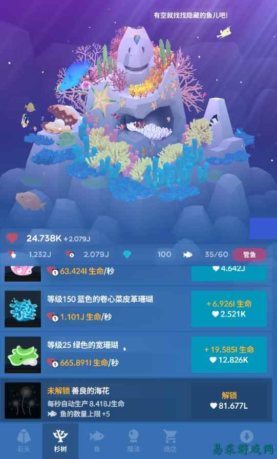 说到放置手游,顾名思义,就是那些初期需要动动手指头做些简单操作,然后就能放在那儿不用管它,自己也能生生不息的游戏。从《点杀泰坦》以及由此衍生各种山寨品,到网络游戏《十万个大魔王》,甚至一些奇葩向的《愚公移山》,都曾经掀起过一股热潮。 有的人对着屏幕狂点得不亦乐乎,而旁观者就不解了:这么简单的游戏,有啥好玩的?多无聊啊! 曾经我也是旁观者之一,直到我自己玩了《猫咪后院》,解锁萌萌的小猫咪给它们拍照之后,就成了那段时间最大的乐趣。 不过对于放置类手游,由于机制简单易于复制,也造成了山寨成本低、各种粗制滥造品充斥市场的现象。搜索“疯狂点击”,至少能找到几十款类似的玩意儿,大多数都只是换了个皮儿,什么西游啊三国啊怪兽啊各种被狂扁。 不过其中也不乏精品,比如刚才提到的《猫咪后院》,凭借有趣的题材和暖萌的猫咪动画,立刻就能俘获一众玩家的心。而最近App Store首页推荐过的另一款游戏《深海水族馆》(AbyssRium),又将放置类手游的颜值提升到了一个新高度。 一开始画面上只有一块有着大大的笑脸的石头——孤独的珊瑚石。玩家需要做的,就是不停地戳屏幕,产生红心(也就是生命值)来解锁新的珊瑚和鱼儿。 听起来感觉又是一款《菇菇实验室》?然而这个游戏可是没有进度重置的功能的哦。有多达40种珊瑚和40种鱼儿可以解锁!有娇小型的小丑鱼、虾虎鱼,更有海马、河豚,甚至是图标中那只巨大的蓝鲸。恩,还有一条由像素组成的翻车鱼。 除了按部就班攒生命值解锁新鱼类,游戏还提供了很多隐藏要素,只有3种是需要花钱购买礼包解锁,其他全部是通过对游戏的操作(比如一天打开游戏20次啦,狂戳屏幕左上方1000次啦,放置1个小时啥也不干啦),或者给特定的鱼儿拍照来解锁的,简直就是游戏界的良心啊! 除了戳屏幕,每隔一段时间游戏会提供看广告的方式来免费获取生命和钻石,所以即便一分钱不花也是可以得到不少钻石来解锁珊瑚石技能的。珊瑚石上隔一段时间还会出现一个宝箱,点击宝箱也可以看广告,得到的奖励是随机的,有时候是生命,有时候是钻石,也有可能解锁隐藏鱼类哦! 有一件事,非常重要,那就是买一条新鱼的价格并不是按种类来的,而是按当前拥有的鱼儿总数,到后面即使是买一条小丑鱼也是死贵死贵的。所以前期千万不要手抖买太多初级鱼,养了好多小丑鱼的我已哭晕。 另外因为本地化的问题,同样的一种鱼会出现两个名字,比如紫雷达就是虾虎鱼,天使鱼就是神仙鱼等等,不过也不影响游戏体验啦。 不管是解锁隐藏鱼类还是参与摄影展,开发商都在鼓励各位玩家多多拍照分享。进入拍照模式后,可以单击小鱼追踪,或者放大画面近距离观察,还可以旋转角度,拍出来的照片可以当手机壁纸有木有!此外还提供了VR模式,配合Cardboard或者VR设备欣赏自己一手创造的海底世界,聆听着美妙舒缓的音乐,也是一种难得的体验呢。 虽然一样是戳屏幕的游戏,但是本作凭借着五彩斑斓的海底世界和美妙的音乐让放置类游戏的颜值到达了一个新高度。你的目标就是在珊瑚石上栽种更多的珊瑚,养更多的鱼,让自己的这一方水域变得越来越生机勃勃。有玩家做出了如下评价,感觉还挺有道理的呢: 画面挺少女的,我认为它是治愈类的,就像游戏里说的它是你的幻想空间,什么都不干看着鱼在海底游我就能玩一天你信吗,比较温馨吧,可能有人觉得比较无聊,这就属于小说里那种空间种田,暗戳戳的开心自己能拥有这么多的鱼~ |