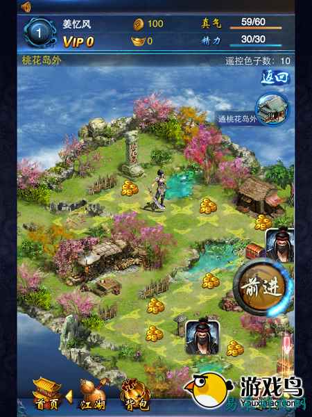 战斗时的视觉效果还不错 虽然还是传统的关卡形式,但推图的过程变成了扔骰子,以至于刚刚进入副本的时候我恍惚了一下以为是武侠版大富翁了。扔骰子前进的过程中可以得到金币、经验、武功等不同奖励,而在碰到敌人的时候不管扔出来的是几点,结果都是触发战斗。获胜后得到的奖励有点儿千奇百怪,出现了"铁矿LV9"、"云游江湖LV14"这样的东西,前者还好理解,后者不点开背包查看详情还真不知道是干嘛用的——其实这两种道具就是喂装备、喂侠客吃的经验卡。 推图形式变成了扔骰子 说到侠客升级,虽然基本上每场战斗都能拿到"云游江湖"、不用担心材料卡不够,但很蛋疼的是主角卡牌的强化次数是有限制的!我在玩儿的时候系统告诉我主角卡牌每天只能强化3次,不知道高等级VIP能不能摆脱这个限制?不过需要特别注意的是,主角卡"仅限强化3次"的概念是"仅限吞噬3张经验卡"。另外其他卡牌的等级不能超过主角卡牌,这样的设定虽然正常,可如果和"主角卡强化次数受限"结合起来看的话,这是一件多么忧桑的事情,只能通过不停的刷图来赚取主角卡的经验了。