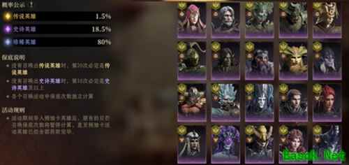 游戏中共有着三百多张卡,数量相当之多。抽卡时传说卡的概率为1.5%,并且70发保底传说英雄,10发保底史诗英雄。