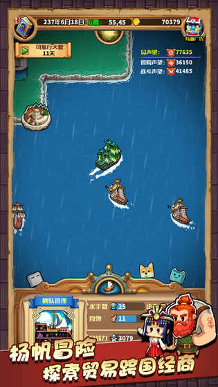 很好玩的航海游戏,任务明了,界面简洁,可玩性丰富,打海怪,斗海贼,货物买卖,还能攻击货船。刚开始玩的时候货仓不大,还要算着食物,到了前中期就就没什么关系了(应该是吧,才逛了两个海域),水手方面也很有趣,满了耗粮快,少了战斗力低,需要自己调配。