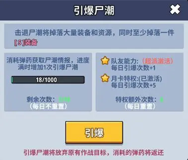 *配图请以游戏内实际为准同时引爆尸潮是一项快速获取装备的重要手段,因为引爆尸潮可以获取大量的装备和资源,同时保底获取指定等级的装备,所以这个过程中,首先要提升自己消耗的弹药数量,同时拉满自己可以获得的各种额外引爆尸潮的机会,这样才能将引爆尸潮的作用发挥到极致。