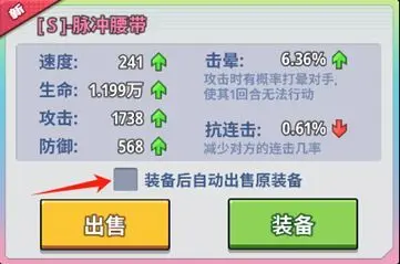 02更换武器装备的小技巧建议在前期先不要勾选【装备后自动出售原装备】,因为新的词条可能会提升或者拉低整体的战力,所以可以先将获取到的装备放入背包,明确好发展思路并对比好战力提升与否后再进行装备的替换和售出。