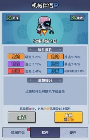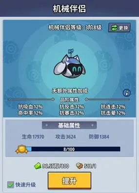 *配图请以游戏内实际为准二、机械伴侣的培养与应用机械伴侣通过提供关键词条属性,增强你在战斗中的防御与反击能力。词条属性:抗吸血,词条解释:减少对方的吸血百分比;抗反击,词条解释:减少对方的反击几率;抗连击,词条解释:减少对方的连击几率;命中率,词条解释:减少对方的闪避几率;抗暴击,词条解释:减少对方的暴击几率;抗击晕,词条解释:减少对方的击晕几率;