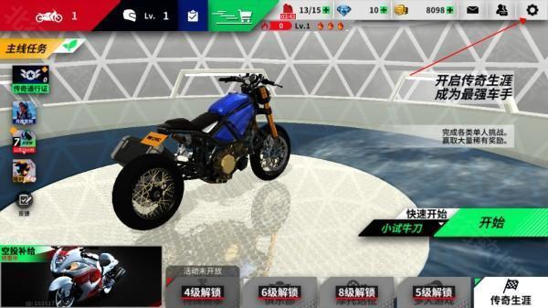 2、这里要比拼的是直线加速,所以注重摩托车的【最高速】和【加速度】性能,需要升到5级以上才可能过关