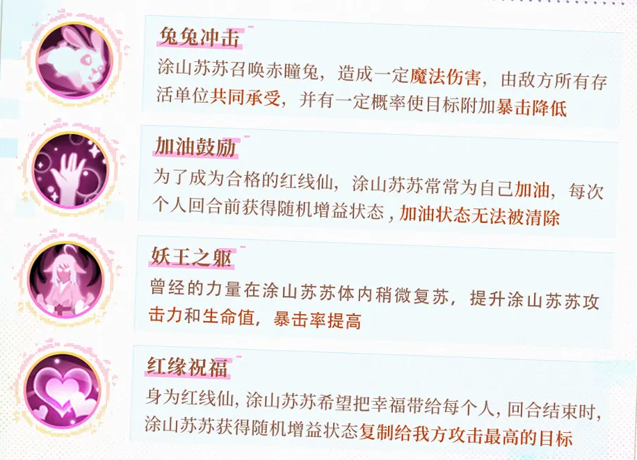 身为红线仙,涂山苏苏希望把幸福带给每个人,回合结束时涂山苏苏获得随机增益状态复制给我方攻击最高的目标