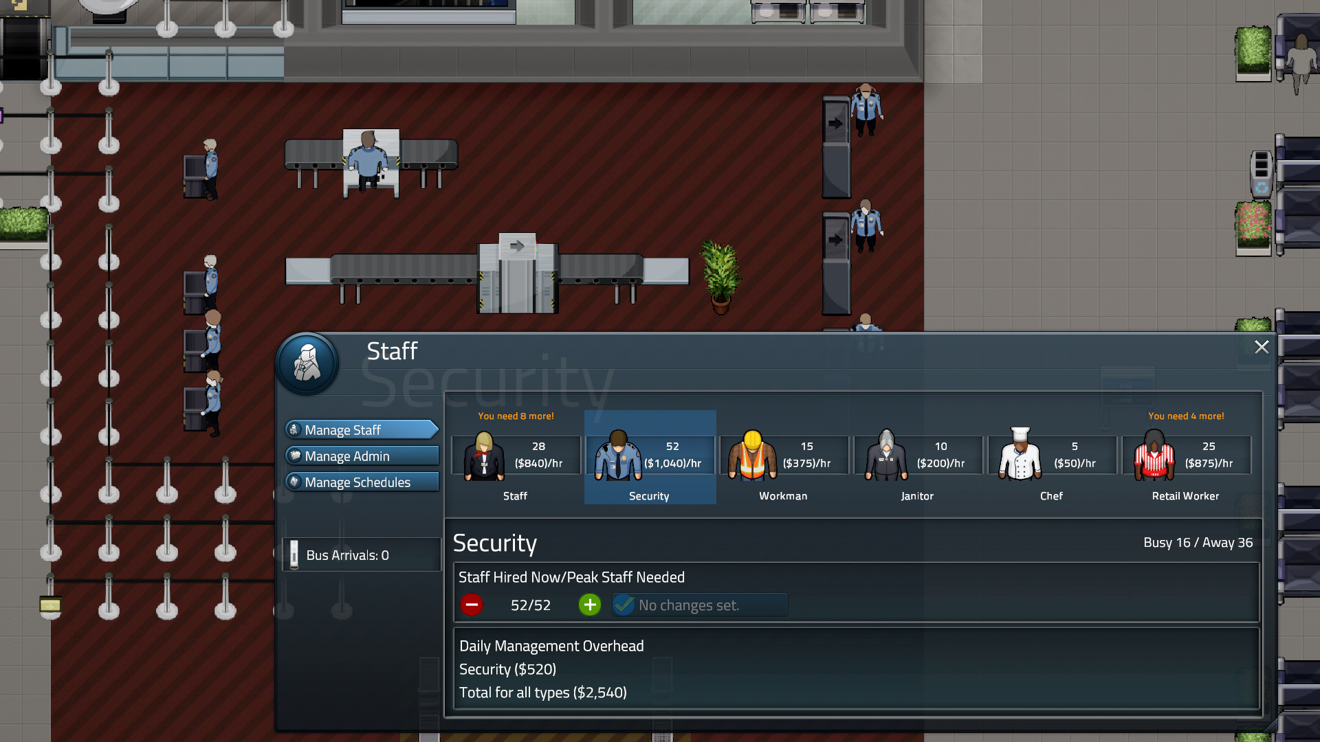 建设您的航站楼,雇用员工,签订航空公司合同,调整每日航班时间表,配置备用登机口可用性,规划和设计基础设施-行李处理系统,道路和滑行道,加油系统,跑道,登机口,机库,服务车辆以及两者之间的一切。深入模拟的游戏过程,每个细节都会产生影响-直到垃圾桶。