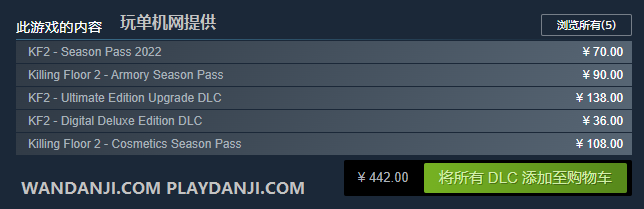 allweapons (给你一堆突击步枪和霰弹枪用,但不是给所有的枪)imrich (给1w钱,用之不尽)open tradermenu (打完一波后才能用,在任何地方打开商店菜单,东西随便买)healme 100 (加满血)allammo (加满子弹)armorme 100 (加满护甲)god (生命无限)本游戏包含的DLC如下图所示(全部)