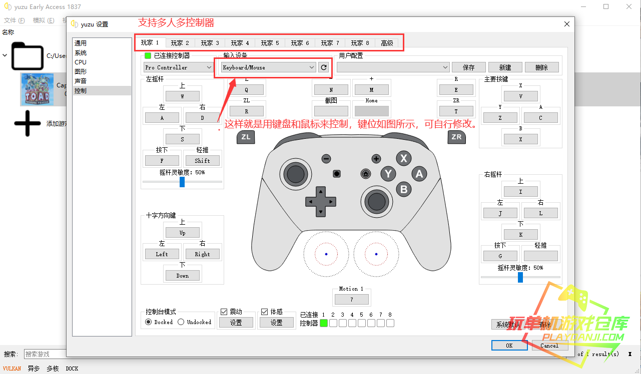 默认设置为键鼠控制,同时支持多人游玩(但需要游戏支持,同时使用不同的输入设备)