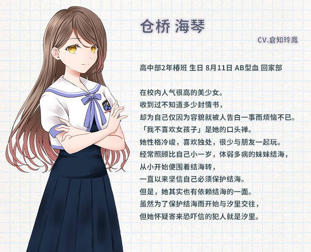 最终,为了保护结海,她选择向汐里告白。海琴「居然还用恐吓信来威胁我,就这么想和我交往吗?」