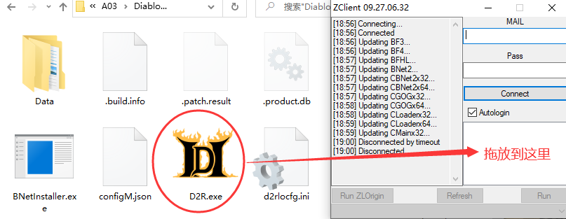 7.将D2R.exe直接拖到右侧空白处(必须登录成功状态才可以拖放)