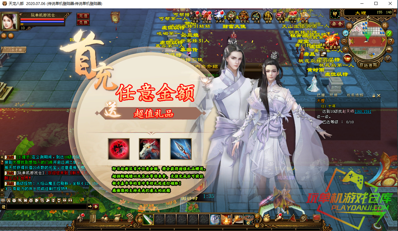 已开放活跃值宝箱、每日签到、大区排行、副本扫荡、工资任务、幸运抽奖、金玉觅宝盆、新服欢乐月等官方功能。