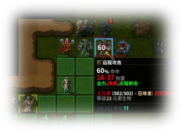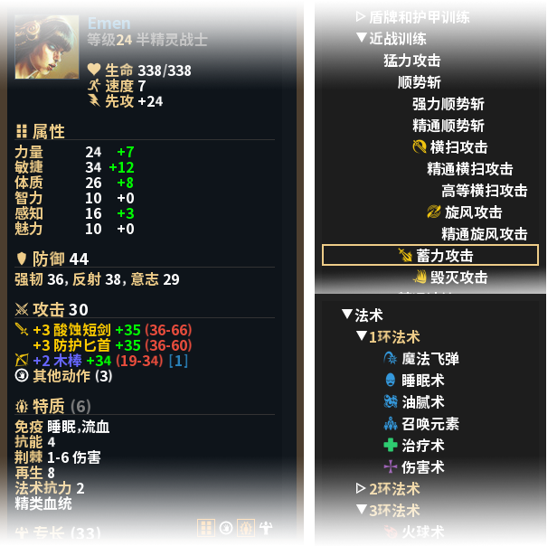 精心设计的技能/法术:战系专有的各种范围武器技,打破了传统战士只会平砍的尴尬局面;精选并强化的睡眠术/油腻术/召唤元素等各种奥术/神术,让玩家在面对同一战况时有多种解决方案;各种怪物特有能力及其造成的变形/恐惧/疯狂/魅惑等特殊状态,使战斗始终保持一定的挑战性。