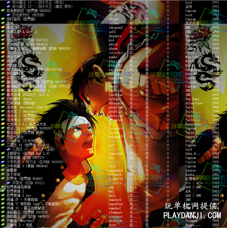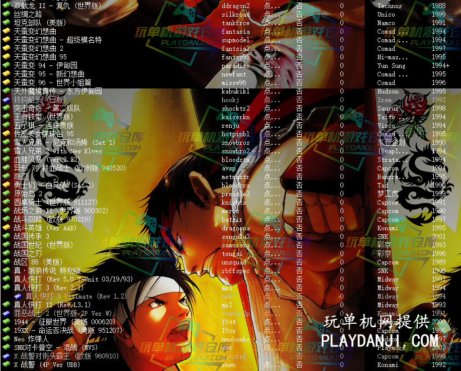 X战警 炸弹人 真人快打 战国世纪 圆桌骑士 雪人兄弟 五子棋 天蚕变 双截龙 坦克 侍魂 世界英雄 泡泡龙 月华剑士 魔法剑 恐龙快打 雷电 魂斗罗 豪血寺一族 街霸 合金弹头 格斗之王 风云默示录 饿狼传说 俄罗斯方块 阿拉丁神灯 1944 海底大作战