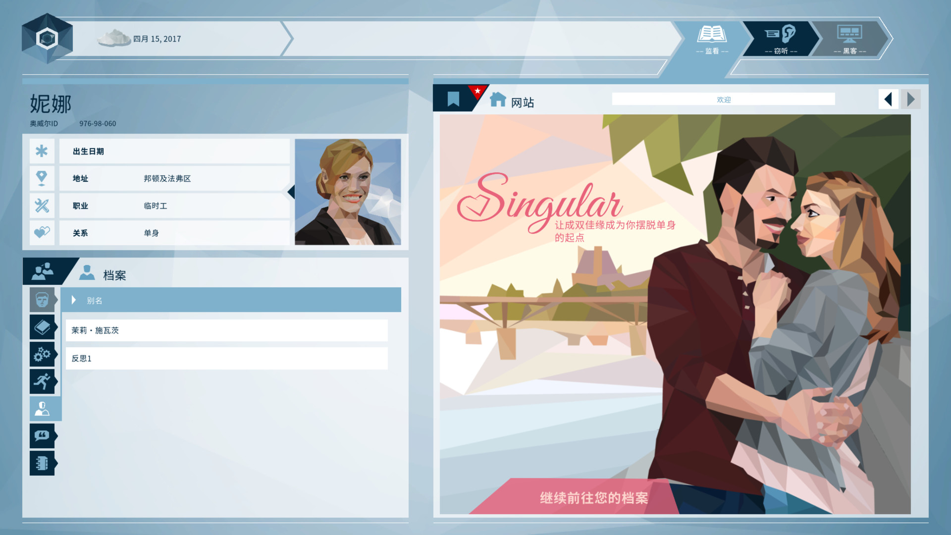 经过千挑万选,你从成千上万名申请人中脱颖而出,被选为奥威尔的第一名人类调查员。当一次恐怖袭击震动国家首都邦顿时,奥威尔和你立即被投入测试。先从单个嫌疑人开始,你将帮助安全部门构建一个潜在罪犯网络。