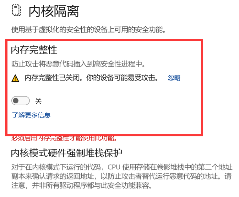打开Windows安全中心,找到设备安全性,点击内核隔离详细信息,把内存完整性关闭即可,关闭后重启,再进游戏就OK了