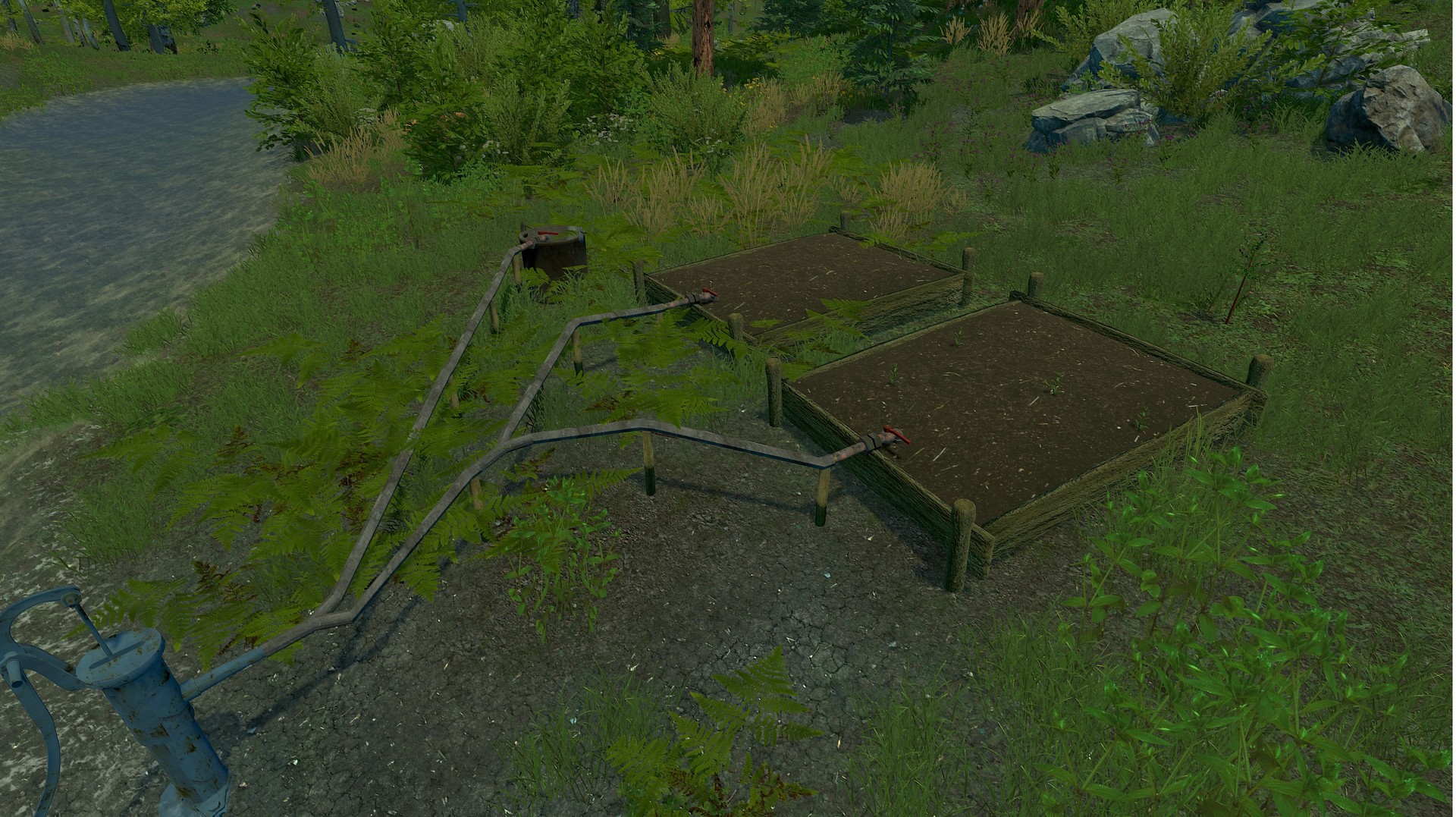 种植作物,用水泵和水管给种植盆浇水。
