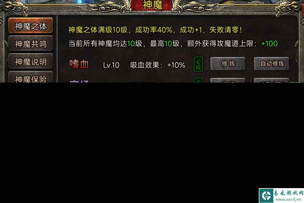 [使用条件]4转 [嗜血]吸血效果大幅提升 [穿扬]百分比无视双防 [怒斩]百分比伤害加成 [激斗]暴击倍率巨幅提升 [强身]体力加成提升血量 所有神魔条目达标、单个神魔提升更高级,都可获额外攻魔道上限! 所