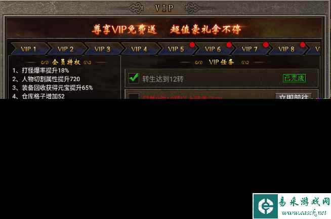 游戏内完成VIP任务,即可免费提升VIP等级,提升等级后获得尊享特权,同时领取对应VIP奖励。 特权内容: 1、打怪爆率提升 2、人物切割居性提升 3、装备回收获得元宝比例提升 4、仓库格子增加 5、增加聚宝盆每分