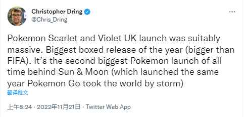 GamesIndustry的主编Christopher Dring今日发文表示,任天堂新游《宝可梦 朱/紫》实体版在英国的首发销量非常高,现已超过《FIFA 23》成为英国今年实体首发销量之最。《宝可梦 朱/紫》也成为了《宝可梦 日