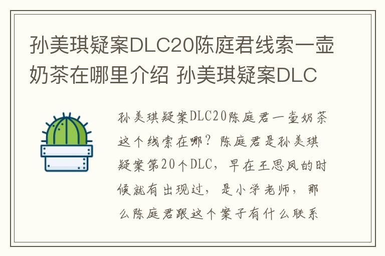 孙美琪疑案DLC20陈庭君一壶奶茶这个线索在哪?陈庭君是孙美琪疑案第20个DLC,早在王思凤的时候就有出现过,是小学老师,那么陈庭君跟这个案子有什么联系呢?那么下面小编就给大家带来了孙美琪疑案DLC20陈庭君线