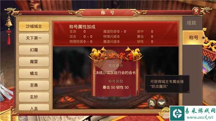 《传奇世界3D》手游中完成特殊成就,即可获得狂霸酷炫的游戏专属称号。比如在决战沙城活动中获胜行会的会长即可获得沙城城主称号,称号不仅可以显示在游戏画面中,还能提升玩家大量游戏属性。称号系统详细介