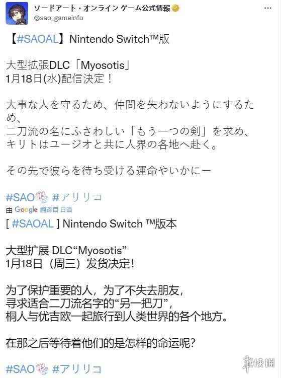 据官方推特消息,Switch版《刀剑神域:彼岸游境(Sword Art Online Alicization Lycoris)》的第一弹DLC“Myosotis”将于1月18日在发售。 该DLC讲述了桐人梦到在与阿多米尼斯多雷特的战斗中