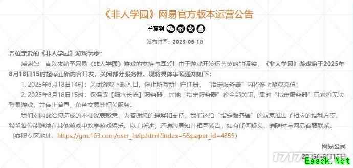 AI对话Error:提供的请求 URI 无效。请求 URI 必须为绝对 URI 或必须设置 BaseAddress。2025年6月18日,网易游戏旗下的二次元MOBA手游《非人学园》在其官方渠道发布了重要公告,宣布该游戏将于2025年8月18日