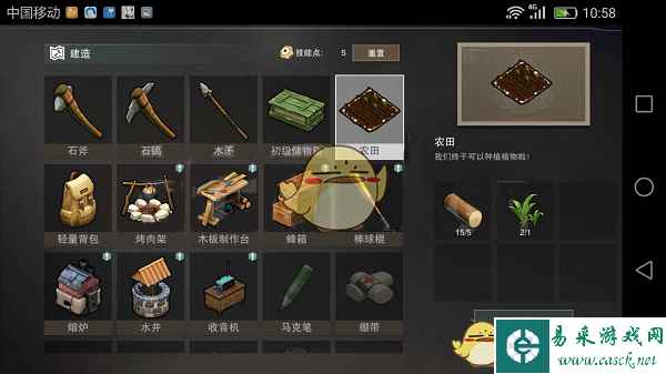 废土危行手游中,农田可以种植出作物供玩家恢复体力。那么废土危行农田怎么制作?不知道的小伙伴,让我们一起来看看吧~ 工具名称:农田合成材料:木头*5、草*1工具用途:用来种植蔬菜,可以把收集到的种子放到菜园中