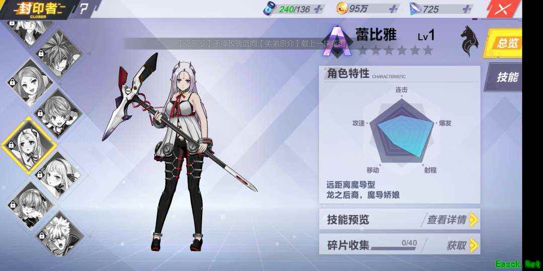 蕾比亚是封印战记游戏中一位A级的强力远距离魔道封印者,今天小编就为大家带来了封印战记蕾比亚的技能介绍,有兴趣的小伙伴一起来看看吧。 蕾比亚技能介绍角鞭向正面突击,鞭打敌人。突击时,可以沿着输入的方