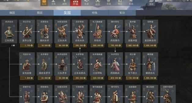 吴国三条兵线分别为突击兵,枪盾兵和弓兵,官方设定第一条线是轻装到重装突击兵,实际上初阶中阶高阶的对局中,这条线都是轻步兵,护甲跟其他人比永远是排在倒数第二,甚至连重装弩兵的护甲都比不过,也就是比弓兵强
