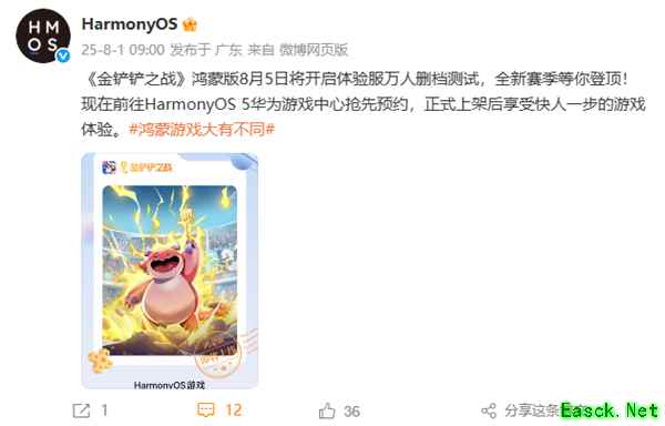 8月1日消息,今日,HarmonyOS官方微博透露,金铲铲之战鸿蒙版将于8月5日启动体验服的万人删档测试。华为用户可登录HarmonyOS 5中的华为游戏中心进行预约,在游戏正式上线后即可第一时间参与体验。此次推出的鸿