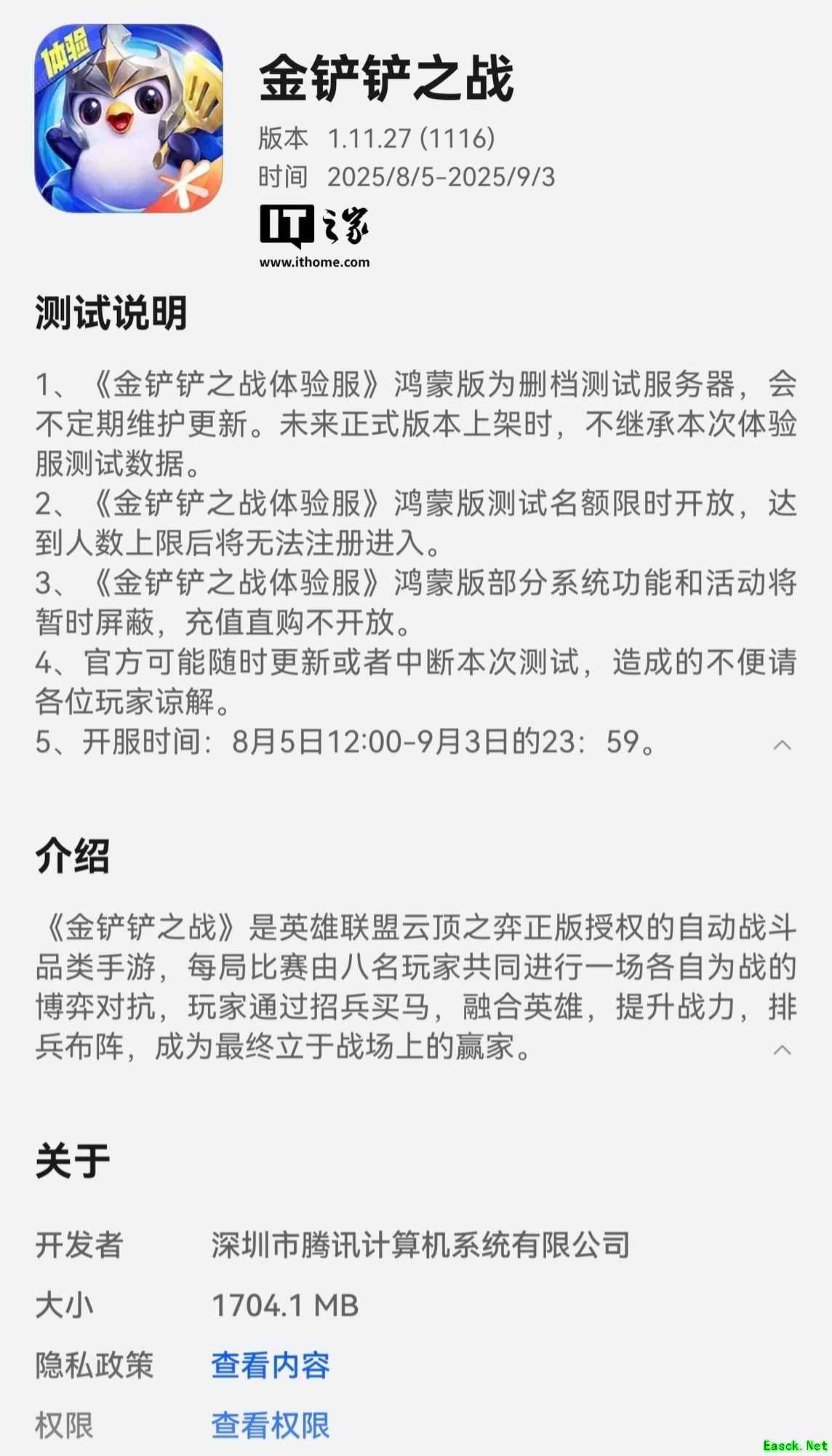 腾讯旗下游戏金铲铲之战鸿蒙版于今日凌晨在华为应用市场(App Gallery)的“应用尝鲜”专区开放下载。该版本已于中午12点开启万人规模的删档测试,版本号为1.11.27,玩家可直接下载安装,无需等待短信通知或通过