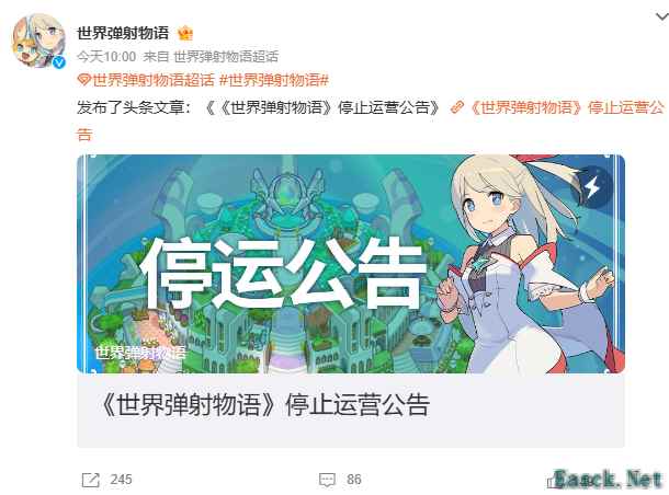 《世界弹射物语》国服官方今日发布公告,宣布游戏将于2025年8月14日正式停止运营。公告显示,游戏已于今日上午10点关闭充值功能,6月26日12:00,游戏内将陆续常驻开放各角色卡池、各限时活动,直至正式停止运营