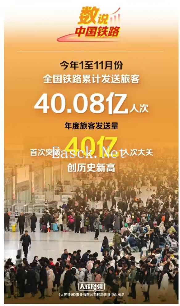 中国国家铁路集团有限公司今日宣布,今年1至11月份,全国铁路累计发送旅客40.08亿人次,年度旅客发送量首次突破40亿人次大关,创历史新高。我国铁路客运量、客运周转量等主要旅客运输指标稳居世界首位。