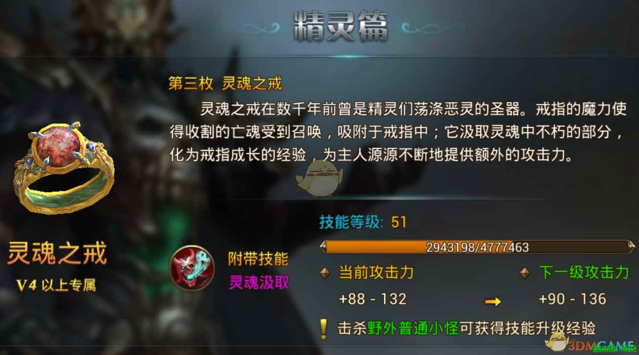 永恒纪元戒中的灵魂之戒是一枚V4专属魔戒,同样也是属于精灵之戒,它可用来提升击杀野怪的经验值,下面一起来看看精灵之戒的技能吧。 魔戒背景故事: 第三枚:灵魂之戒灵魂之戒在数千年前曾是精灵们荡涤恶灵的圣