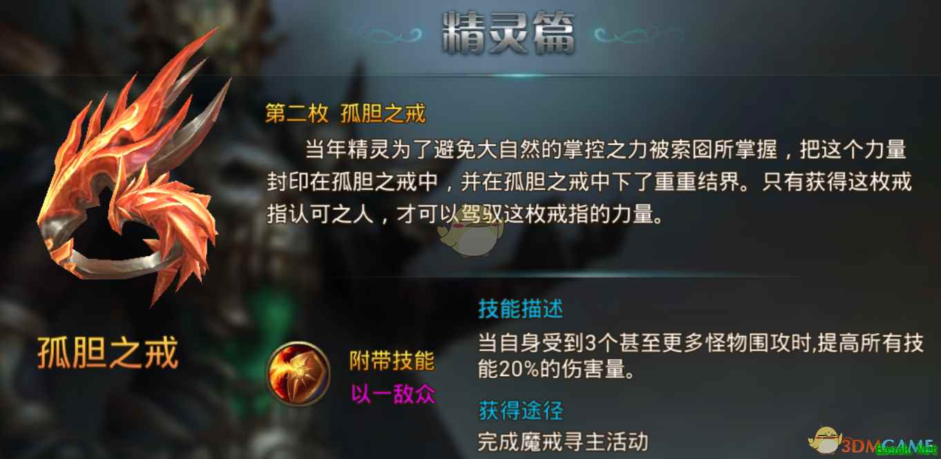 永恒纪元戒孤胆之戒是精灵戒中的第二枚,这枚魔戒的附加技能与其他魔戒有所不同,让我们一起来看看孤胆之戒的具体技能是什么吧。 魔戒背景故事: 第二枚:孤胆之戒 当年精灵为了避免大自然的掌控之力被索囵所