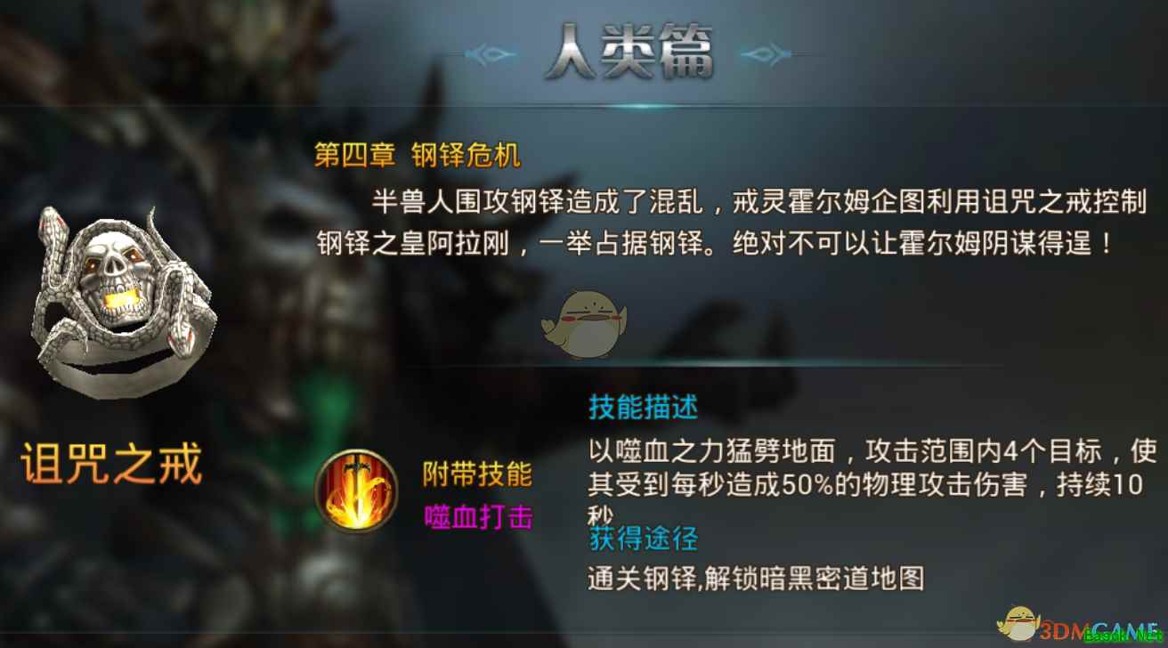 永恒纪元戒中的魔戒可按人类之戒、矮人之戒和精灵之戒分为三种,诅咒之戒就是其中的一种人类之戒,此魔戒可造成大范围的伤害,下面来看看诅咒之戒的具体技能介绍。 魔戒背景故事: 第四章钢铎危机半兽人围攻钢