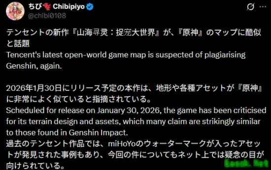 推主chibi0108发帖称,腾讯《元梦之星》新玩法《山海寻灵:捉宠大世界》因地图酷似《原神》引发热议。该玩法定档1月30日上线,但其地形与各类美术资源被指出与《原神》高度相似。评论区一些网友表示,看了预告